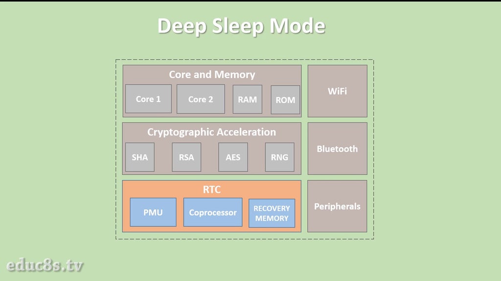 Inside the chip, we can find the two processing cores, the RAM and ROM memory, the WiFi module, the Bluetooth Module, a hardware acceleration module for cryptographic applications, the RTC module, and a lot of peripherals. Inside the RTC module, we can find a PMU (Phasor measurement unit) a small and very low power 32-bit co-processor, and 8Kbs of RAM memory. This small amount of memory is very useful as you are going to find out in a moment.